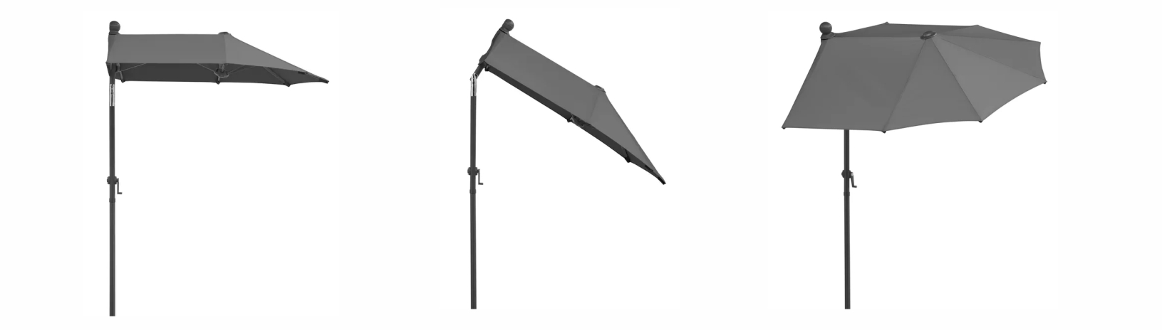 These special parasols have a semi-circular roof and, because the mast lies flat against the wall, they are particularly practical for small balconies. Additionally, they have adjustable joints for lateral tilting and are also tilt-able. This allows this balcony parasol to be optimally adjusted to the sun's position and provides sufficient shade.