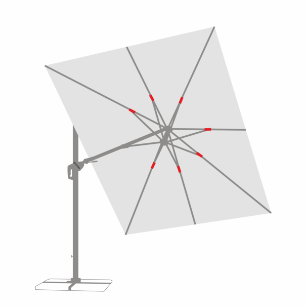 Um einen stabilen Stand des Ampelschirms gewährleisten zu können, wurde der Drehteller mit einer gewissen Vorspannung konstruiert. Das bedeutet, dass der Drehteller sich ausschließlich im komplett aufgebauten Zustand inkl. der eingelegten vier Wegeplatten drehen lässt. Prüfen Sie die korrekte Montage entsprechend der Montageanleitung des Plattenständers. Hierfür sollten Sie prüfen, ob die Schrauben korrekt angebracht sind. Je nach Modell besteht das Schraubenset aus vier oder acht Schrauben. Bei Modellen mit acht Schrauben sollten die langen Schrauben zur Befestigung des Drehtellers auf den Plattenständer dienen und die kurzen Schrauben verbinden das Standrohr mit dem Drehteller. Achten Sie zudem darauf, den Plattenständer mit dem notwendigen Mindestgewicht mit Hilfe von Wegeplatten zu beschweren. Um den Schirm drehen zu können, müssen Sie das Fußpedal betätigen. Da die Drehfunktion des Drehtellers anfangs schwergängig ist, können Sie unterstützend die Hauptstrebe mit Ihrer Hand in die gewünschte Drehrichtung drehen.