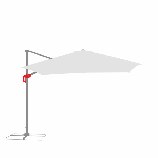 Um einen stabilen Stand des Ampelschirms gewährleisten zu können, wurde der Drehteller mit einer gewissen Vorspannung konstruiert. Das bedeutet, dass der Drehteller sich ausschließlich im komplett aufgebauten Zustand inkl. der eingelegten vier Wegeplatten drehen lässt. Prüfen Sie die korrekte Montage entsprechend der Montageanleitung des Plattenständers. Hierfür sollten Sie prüfen, ob die Schrauben korrekt angebracht sind. Je nach Modell besteht das Schraubenset aus vier oder acht Schrauben. Bei Modellen mit acht Schrauben sollten die langen Schrauben zur Befestigung des Drehtellers auf den Plattenständer dienen und die kurzen Schrauben verbinden das Standrohr mit dem Drehteller. Achten Sie zudem darauf, den Plattenständer mit dem notwendigen Mindestgewicht mit Hilfe von Wegeplatten zu beschweren. Um den Schirm drehen zu können, müssen Sie das Fußpedal betätigen. Da die Drehfunktion des Drehtellers anfangs schwergängig ist, können Sie unterstützend die Hauptstrebe mit Ihrer Hand in die gewünschte Drehrichtung drehen.