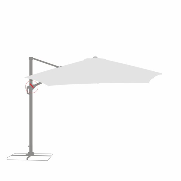 Um einen stabilen Stand des Ampelschirms gewährleisten zu können, wurde der Drehteller mit einer gewissen Vorspannung konstruiert. Das bedeutet, dass der Drehteller sich ausschließlich im komplett aufgebauten Zustand inkl. der eingelegten vier Wegeplatten drehen lässt. Prüfen Sie die korrekte Montage entsprechend der Montageanleitung des Plattenständers. Hierfür sollten Sie prüfen, ob die Schrauben korrekt angebracht sind. Je nach Modell besteht das Schraubenset aus vier oder acht Schrauben. Bei Modellen mit acht Schrauben sollten die langen Schrauben zur Befestigung des Drehtellers auf den Plattenständer dienen und die kurzen Schrauben verbinden das Standrohr mit dem Drehteller. Achten Sie zudem darauf, den Plattenständer mit dem notwendigen Mindestgewicht mit Hilfe von Wegeplatten zu beschweren. Um den Schirm drehen zu können, müssen Sie das Fußpedal betätigen. Da die Drehfunktion des Drehtellers anfangs schwergängig ist, können Sie unterstützend die Hauptstrebe mit Ihrer Hand in die gewünschte Drehrichtung drehen.