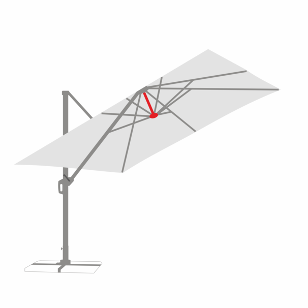 Um einen stabilen Stand des Ampelschirms gewährleisten zu können, wurde der Drehteller mit einer gewissen Vorspannung konstruiert. Das bedeutet, dass der Drehteller sich ausschließlich im komplett aufgebauten Zustand inkl. der eingelegten vier Wegeplatten drehen lässt. Prüfen Sie die korrekte Montage entsprechend der Montageanleitung des Plattenständers. Hierfür sollten Sie prüfen, ob die Schrauben korrekt angebracht sind. Je nach Modell besteht das Schraubenset aus vier oder acht Schrauben. Bei Modellen mit acht Schrauben sollten die langen Schrauben zur Befestigung des Drehtellers auf den Plattenständer dienen und die kurzen Schrauben verbinden das Standrohr mit dem Drehteller. Achten Sie zudem darauf, den Plattenständer mit dem notwendigen Mindestgewicht mit Hilfe von Wegeplatten zu beschweren. Um den Schirm drehen zu können, müssen Sie das Fußpedal betätigen. Da die Drehfunktion des Drehtellers anfangs schwergängig ist, können Sie unterstützend die Hauptstrebe mit Ihrer Hand in die gewünschte Drehrichtung drehen.