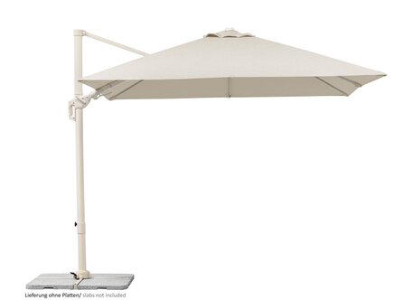 Um einen stabilen Stand des Ampelschirms gewährleisten zu können, wurde der Drehteller mit einer gewissen Vorspannung konstruiert. Das bedeutet, dass der Drehteller sich ausschließlich im komplett aufgebauten Zustand inkl. der eingelegten vier Wegeplatten drehen lässt. Prüfen Sie die korrekte Montage entsprechend der Montageanleitung des Plattenständers. Hierfür sollten Sie prüfen, ob die Schrauben korrekt angebracht sind. Je nach Modell besteht das Schraubenset aus vier oder acht Schrauben. Bei Modellen mit acht Schrauben sollten die langen Schrauben zur Befestigung des Drehtellers auf den Plattenständer dienen und die kurzen Schrauben verbinden das Standrohr mit dem Drehteller. Achten Sie zudem darauf, den Plattenständer mit dem notwendigen Mindestgewicht mit Hilfe von Wegeplatten zu beschweren. Um den Schirm drehen zu können, müssen Sie das Fußpedal betätigen. Da die Drehfunktion des Drehtellers anfangs schwergängig ist, können Sie unterstützend die Hauptstrebe mit Ihrer Hand in die gewünschte Drehrichtung drehen.