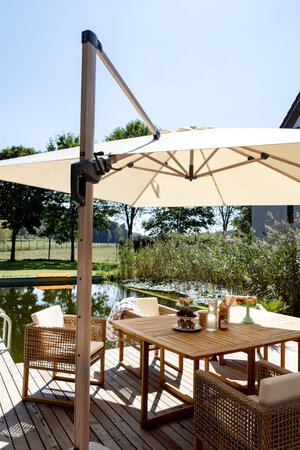 Moderne Ampelschirme zeichnen sich besonders durch Ihre flexiblen Einstellungsmöglichkeiten aus. Beispielsweise lassen sich unsere Ampelschirm-Modelle aus der Reihe Rhodos mühelos um 360 Grad drehen und können an den Sonnenstand angepasst werden.