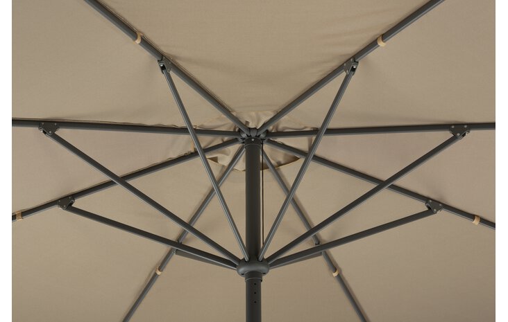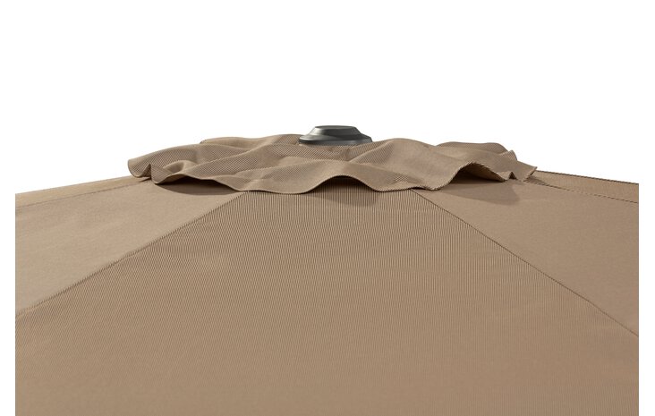 The best way to remove loose dirt or dust is to use a soft brush. In general, you can prevent major contamination by rinsing the cover regularly. However, if serious dirt does occur, the parasol can be cleaned with lukewarm water and mild soapy water. To do this, use a sponge or a soft brush. You should then allow the cover to dry completely on the stretched frame. Attention, the following types of cleaning are not suitable: Use of high-pressure cleaners Wash the cover in the washing machine Abrasive or harsh cleaning agents Clean with hot water (may cause fabric to shrink)