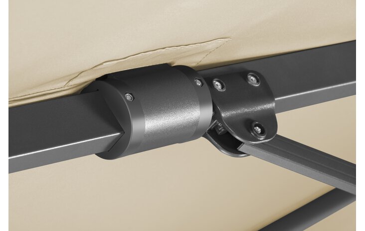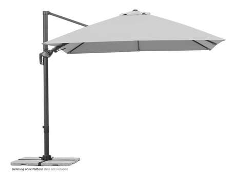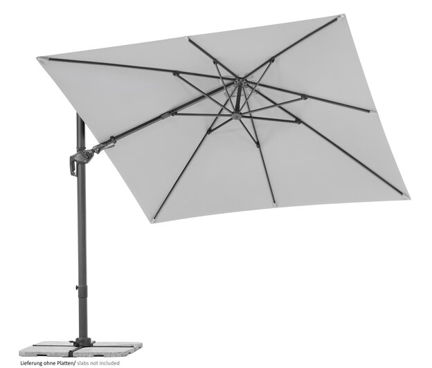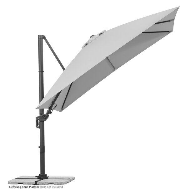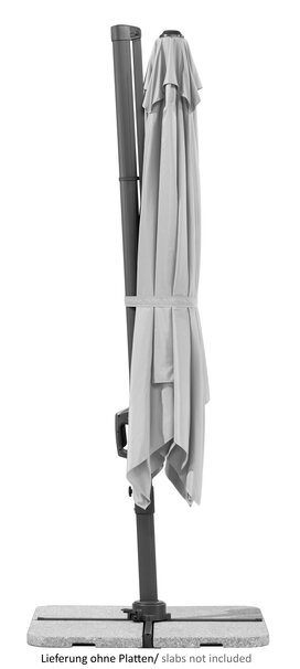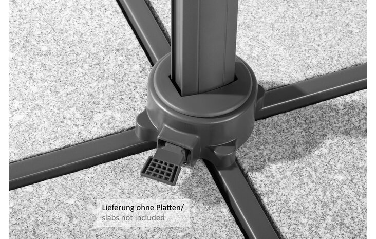 Aluminum/steel frame anthracite grey powder-coated, one-part pole 53 x 80 mm, ribs approx. 26 x 18 mm. Adjustable in 3 dimensions: 1. 360° rotatable via rotary plate with foot pedal, 2. can be tilted up to 50° along the pole, 3. can be tilted up to 45° on both sides along the extension arm (using the handle), includes cross base for paving slabs 50 x 50 x 5 cm (supplied without slabs, min. 25 kg per slab)