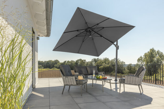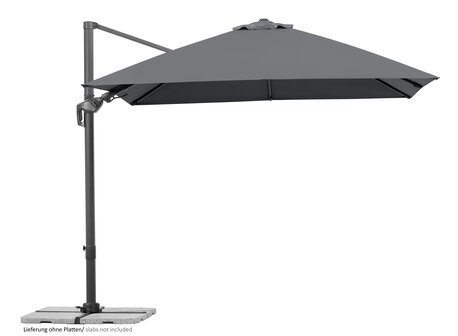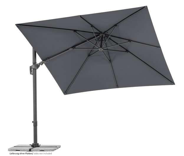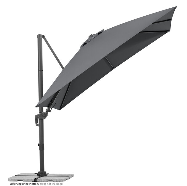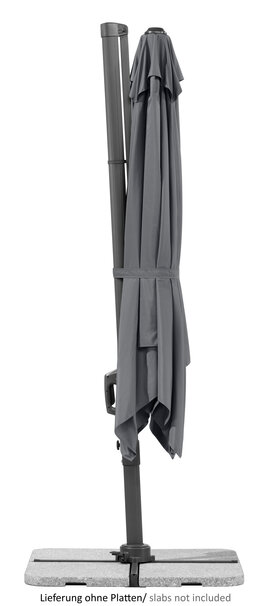 Aluminum/steel frame anthracite grey powder-coated, one-part pole 53 x 80 mm, ribs approx. 26 x 18 mm. Adjustable in 3 dimensions: 1. 360° rotatable via rotary plate with foot pedal, 2. can be tilted up to 50° along the pole, 3. can be tilted up to 45° on both sides along the extension arm (using the handle), includes cross base for paving slabs 50 x 50 x 5 cm (supplied without slabs, min. 25 kg per slab)