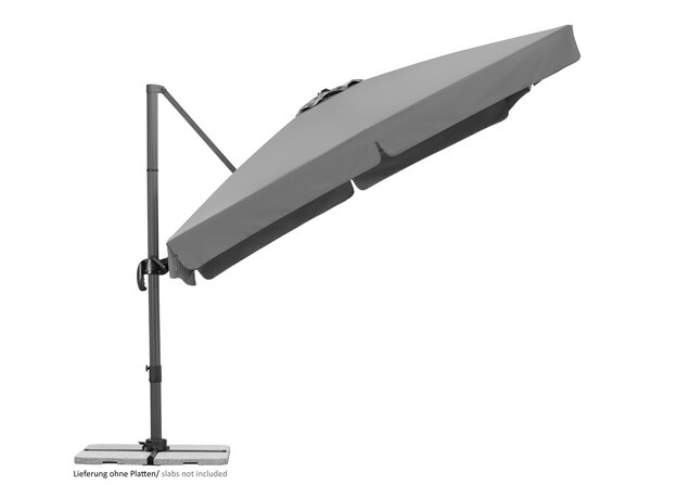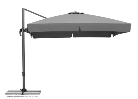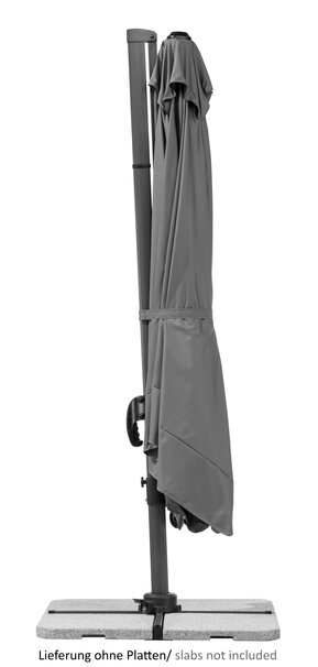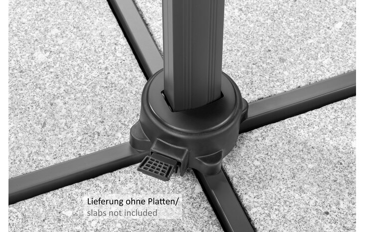 anthracite powder-coated aluminum/steel frame, one-part pole 53 x 77 mm, ribs ca. 14 x 24 mm, rotary plate for rotating 360° with foot pedal, inclinable, very sturdy rib joints, includes cross base for paving slabs 50 x 50 x 5 cm (slabs not included)