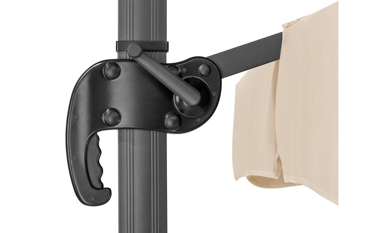 To ensure a stable base for the cantilever parasol, the rotary plate was designed with a certain preload. This means that the rotary plate can only rotate when the parasol is completely assembled, including the four inserted base plates. Please check the correct assembly according to the assembly instructions of the base stand. You should verify if the screws are correctly attached. Depending on the model, the screw set consists of either four or eight screws. For models with eight screws, the long screws should be used to attach the rotary plate to the base stand, and the short screws connect the upright tube with the rotary plate. Additionally, make sure to weigh down the base stand with the necessary minimum weight using base plates. To rotate the parasol, you need to operate the foot pedal. Since the rotation of the rotary plate may initially be stiff, you can use your hand to rotate the main strut in the desired direction to assist the turning.